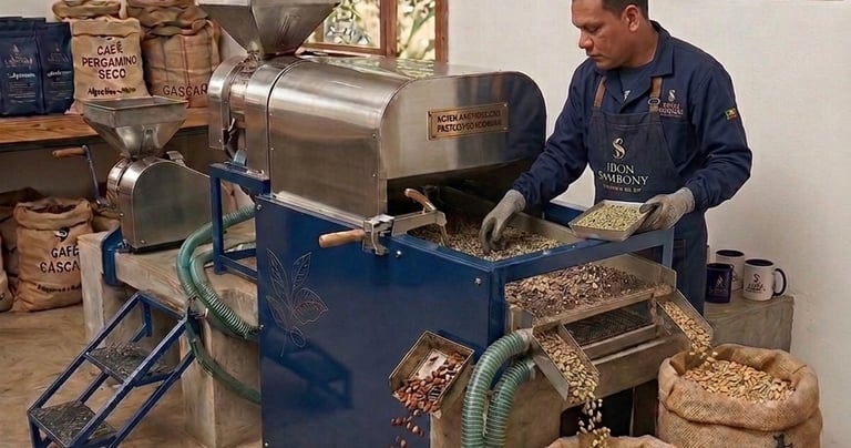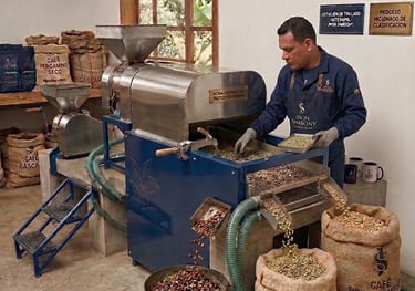 Transformación de café pergamino seco a café verde, garantizando la integridad del grano.